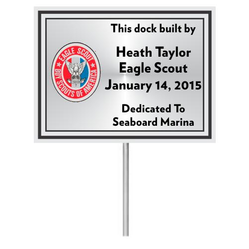 Designed for outside use. This is our Cast Aluminum plaque featured with a raised double border and recessed area for an engraved plate. The UV protective metal engraved plate is inserted into the recessed area of the casting. The plate offers the ability to add full color photos or logos to the casting. This plaque has a cast rear mount to attach the supplied 24" aluminum stake. Your custom logo can be added at no extra charge. Plate designs, color and texture may vary.
